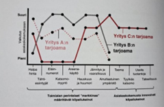 Kirjassa mainittiin seitsemän erilaista strategista työkalua, jotka voivat auttaa asiakaskokemuksen strategista suunnittelua. Nämä seitsemän olivat: Sinisen meren strategia (auttaa siinä, miten asiakaskokemusta voitaisiin kehittää), Porterin viisi kilpailuvoimaa (kertoo, mitkä tekijät muokkaavat asiakaskokemusten välistä kilpailua), Strategiakartta (auttaa tiedostamaan yrityksen tärkeimmät sisäiset syy-seuraussuhteet suhteessa tavoiteltavaan asiakaskokemukseen), VRIO-malli (kiinnittää huomiota miten ja mitkä yrityksen resurssit ja kyvykkyydet ovat kriittisiä hyvän asiakaskokemuksen luomiseen), SWOT-analyysi (hahmottaa yrityksen asema suhteessa kilpaileviin yrityksiin) ja Keno-malli (auttaa ymmärtämään ja priorisoimaan erilaisten ominaisuuksien merkitystä asiakaskokemuksen rakentumisessa). Olen aikaisemmissa projekteissa ja tiimimme treeneissä päässyt tutustumaan joihinkin työkaluihin mitä kirjassa mainittiin. Sinisen meren strategia työkaluna oli itselleni ennestään tuttu, mutta huomaan kuinka en ollut tullut ajatelleeksi, miten kyseinen malli toimisi myös asiakaskokemuksen parantamiseen. Näin jälkikäteen mietittynä, aika usein erilaisia työkaluja voitsaisiin hyödyntääa laajasti ja muokata käyttötarkoituksen mukaan. Uutena työkaluna nousi arvokäyrä mallin (kuvio 2), jonka tarkoituksena on peilata yrityksen toimintoja kilpaileviin yrityksiin. Ymmärrettyäni arvokäyrän toimintaidean voisin jopa todeta sen todella hyväksi, joka konkreettisesti näyttää, miten yrityksen toiminnot ovat verrattavissa muihin kilpailijoihin ja miten sieltä vois löytää uudenlaisia näkökulmia asiakaskokemuksen kehittämiseen. Arvoköyrä malli toimisi mielestäni kilpailija-analyysin tapaan, jossa konkreettisesti havainnollistettaisiin mitä yritykset tekevät toisin ja miten olisi mahdollista erottautua joukosta.