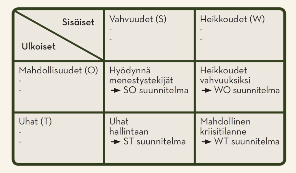- Miten hyödynnetään vahvuudet ympäristön tuomissa mahdollisuuksissa?